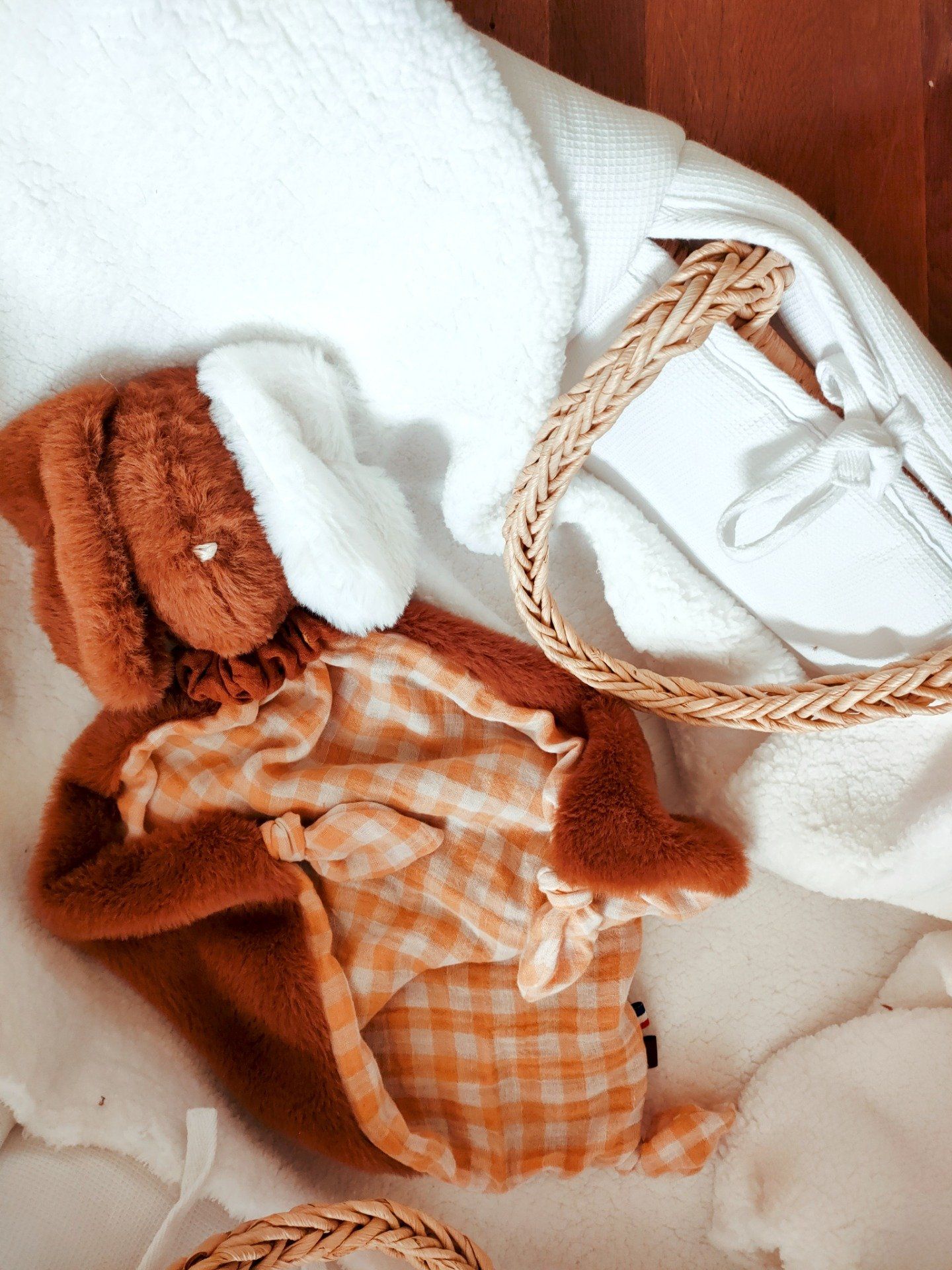 Voici Albus, un adorable doudou plat de 30 x 30 cm, pensé pour accompagner bébé dès ses premiers instants.