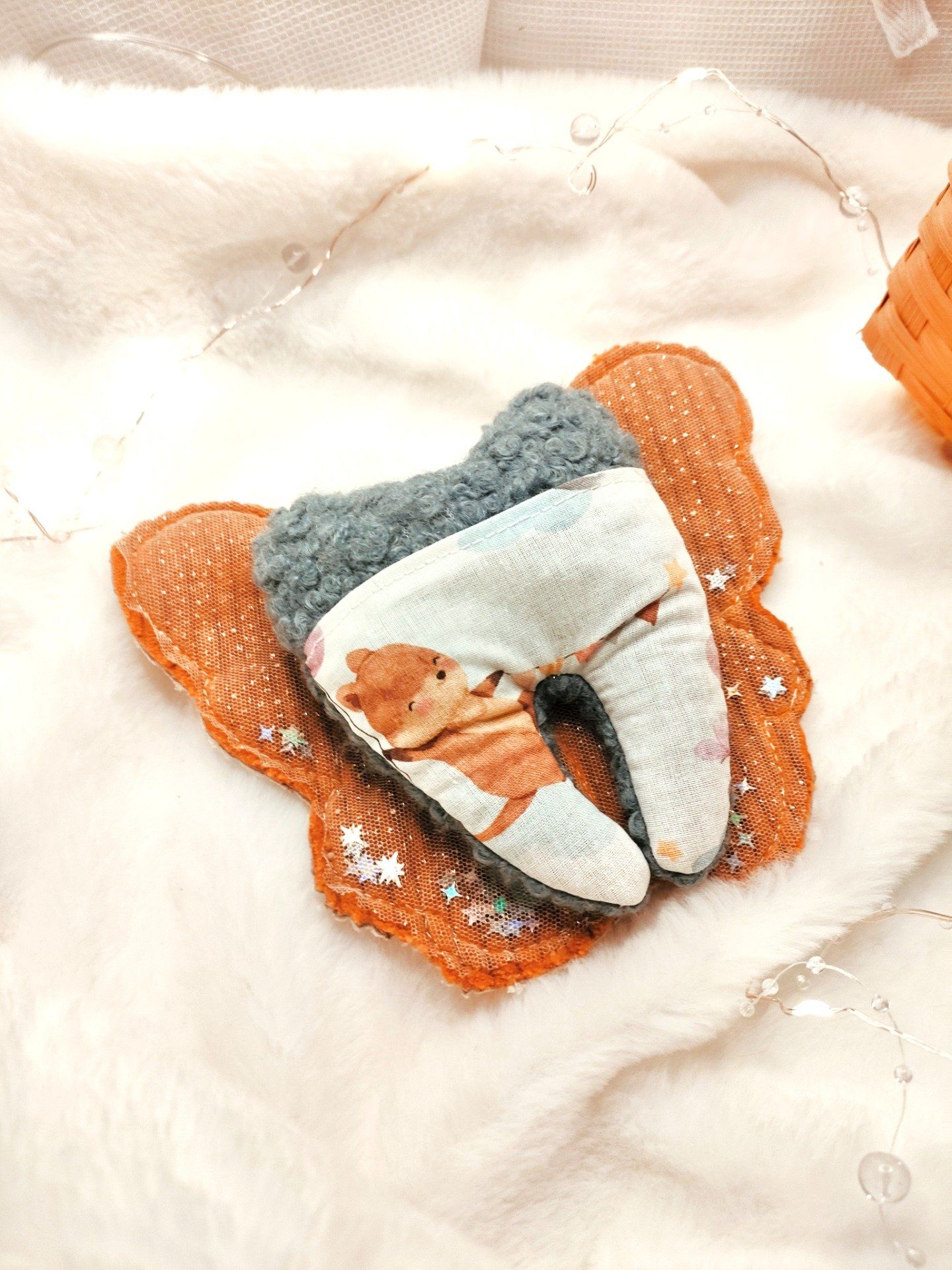 Sur son petit ventre se cache une délicate poche, parfaite pour y glisser une dent de lait et attendre le passage de la Fée pendant la nuit… En échange, un petit présent viendra s’y déposer, comme un trésor venu tout droit du pays des rêves.