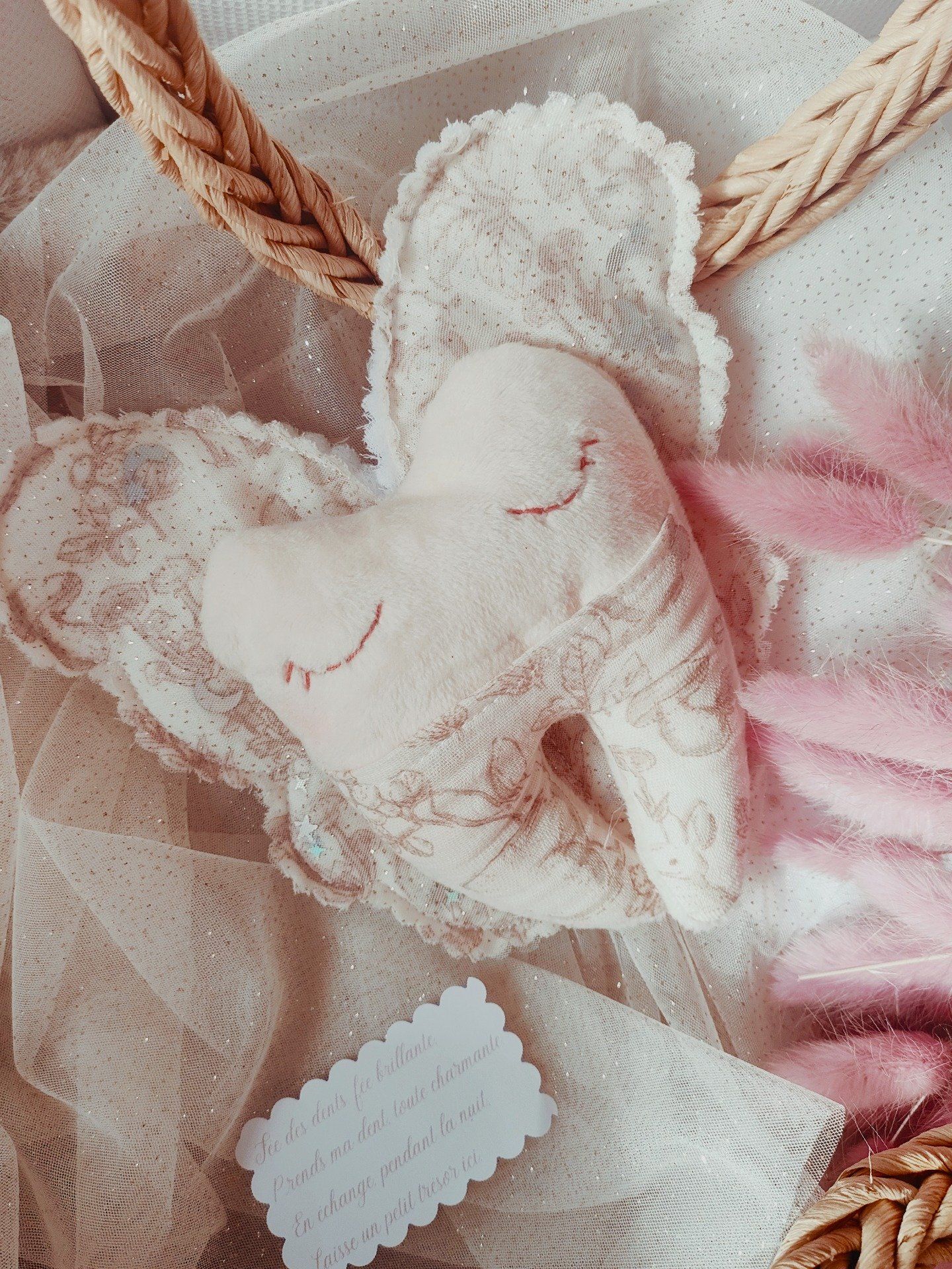 Sur son petit ventre se cache une délicate poche, parfaite pour y glisser une dent de lait et attendre le passage de la Fée pendant la nuit… En échange, un petit présent viendra s’y déposer, comme un trésor venu tout droit du pays des rêves.