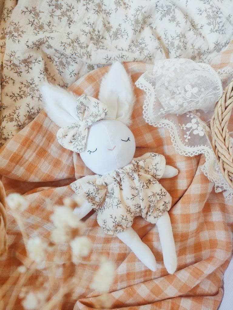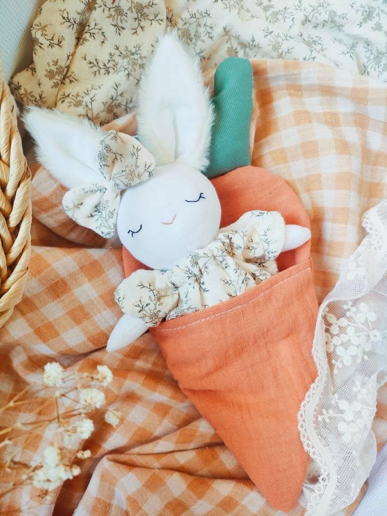 Blottie dans son lit-carotte cousu de rêves orangés, une petite lapine de quinze centimètres sommeille, le cœur empli de secrets tendres et de jeux murmurés.